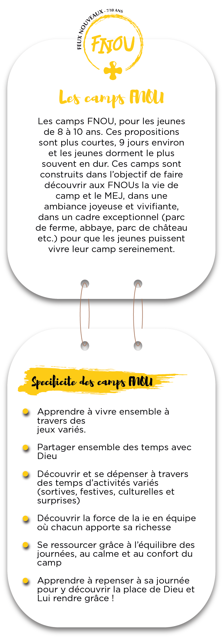 Chaque été, le MEJ propose des camps nationaux, ouverts à tous, sur la période juillet-août. Ces camps sont l’occasion de découvrir ou approfondir autrement sa relation à Dieu, de faire de belles rencontres, et de repartir enrichi et ressourcé !