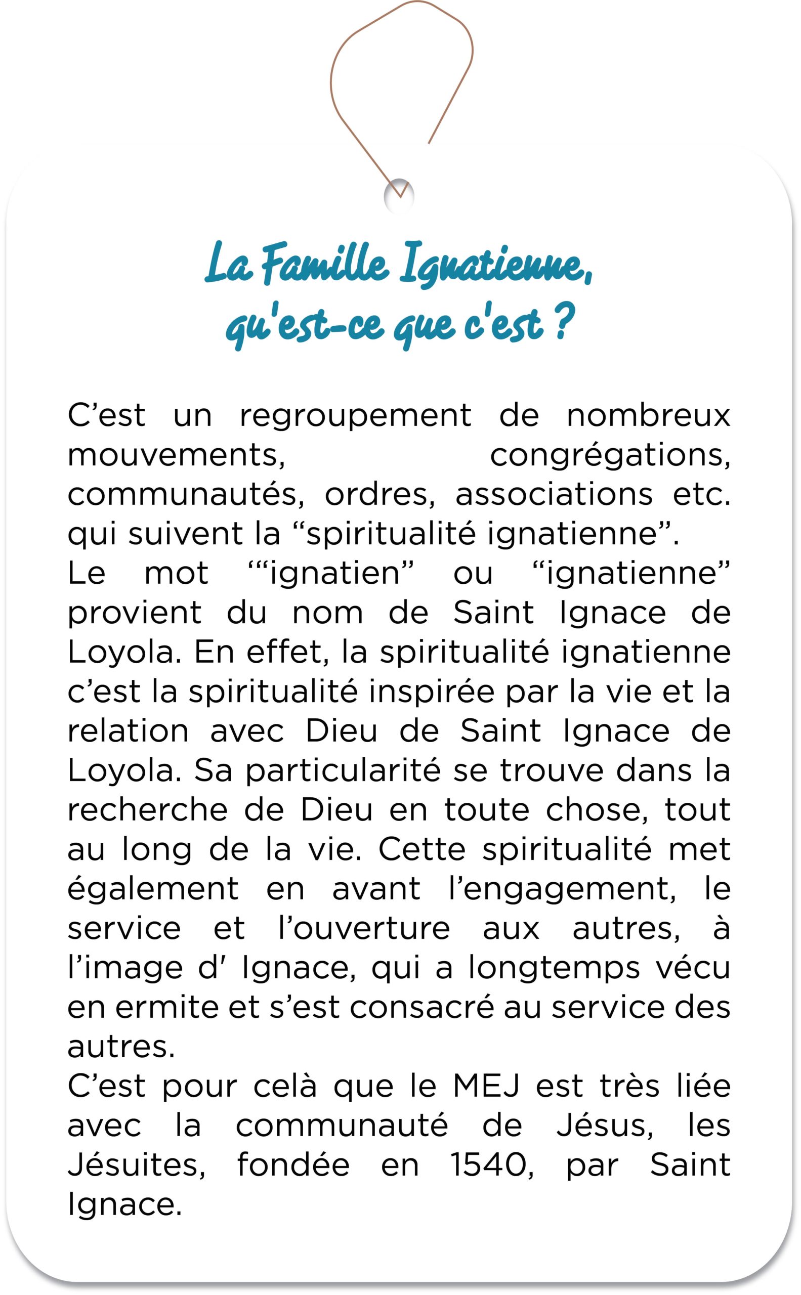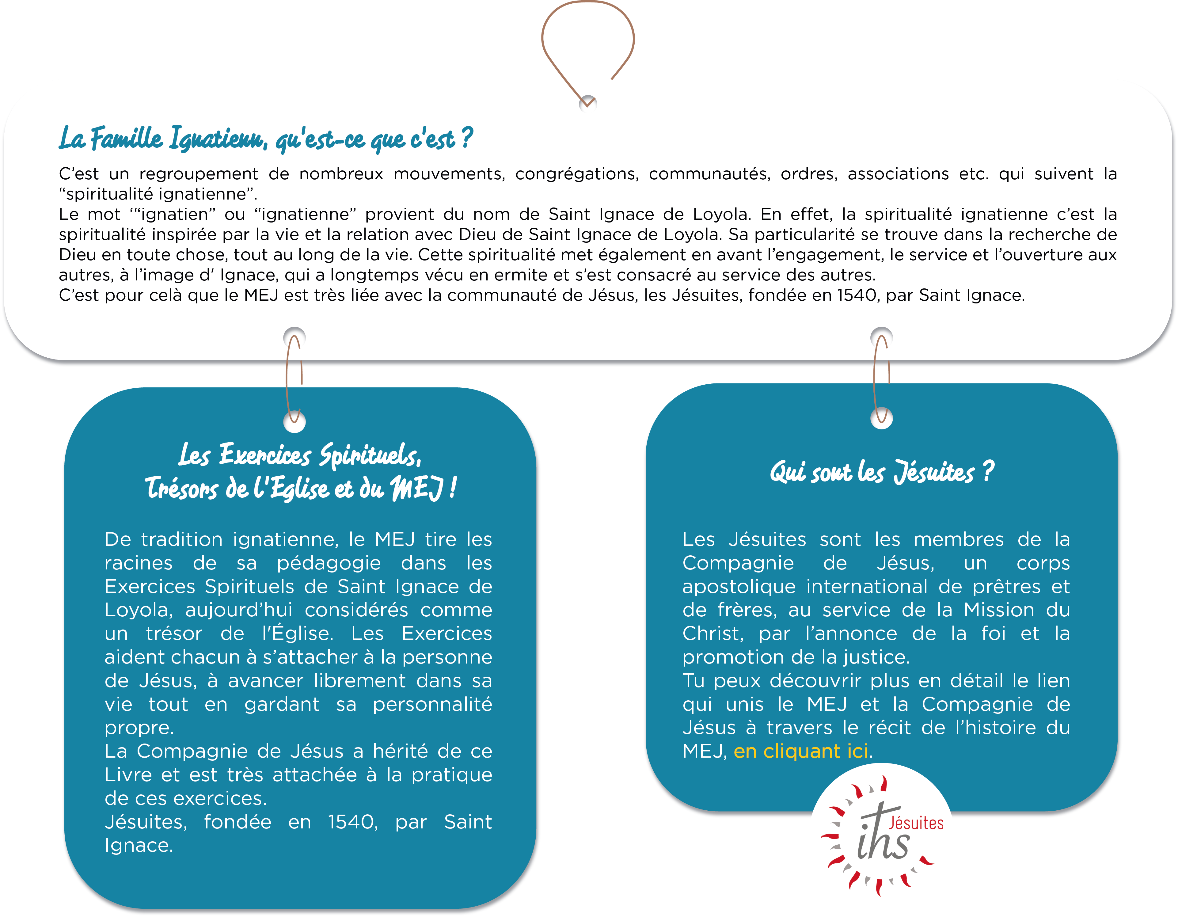 Le MEJ est appelé “mouvement ignatien”, d’abord parce que c’est un mouvement mais surtout car il fait partie de la grande “famille ignatienne”.