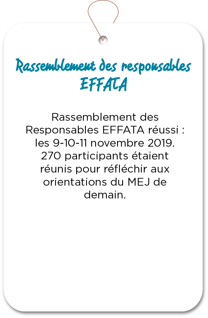 Pour les responsables : Les responsables du mouvement ont aussi le droit à leur moment de fête et de retrouvailles ensemble, c’est le rassemblement EFFATA ! A cet occasion, ils se réunissent pour réfléchir et faire un point sur l’avenir et les grandes orientations du MEJ.