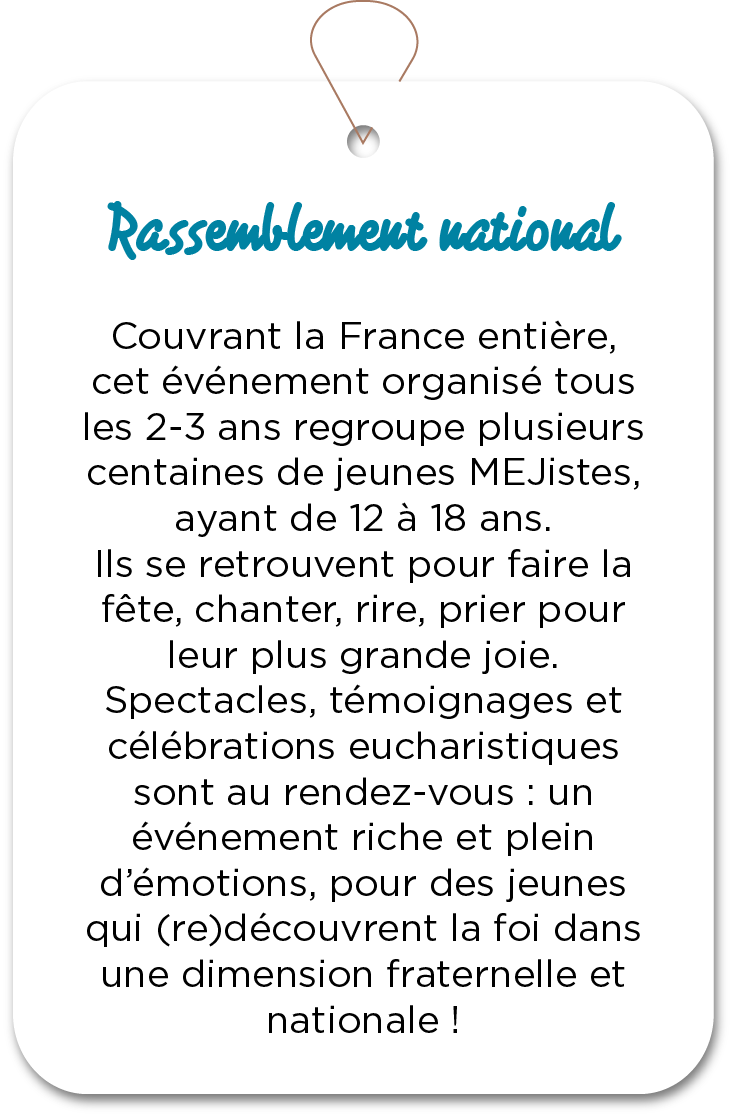 A l’échelle nationale : Un rassemblement, de 3 à 4 jours, est proposé à tous les MEJistes de France entre 12 et 18 ans, tous les 2/3 ans. Ils se retrouvent pour faire la fête, chanter, rire, prier pour leur plus grande joie. Spectacles, témoignages et célébrations eucharistiques sont au rendez-vous : un événement riche et plein d’émotions, pour les jeunes qui (re)découvrent la foi dans une dimension fraternell et nationale.